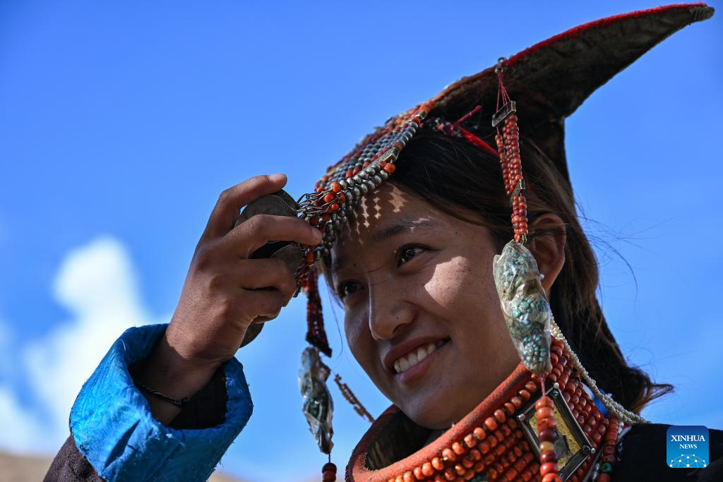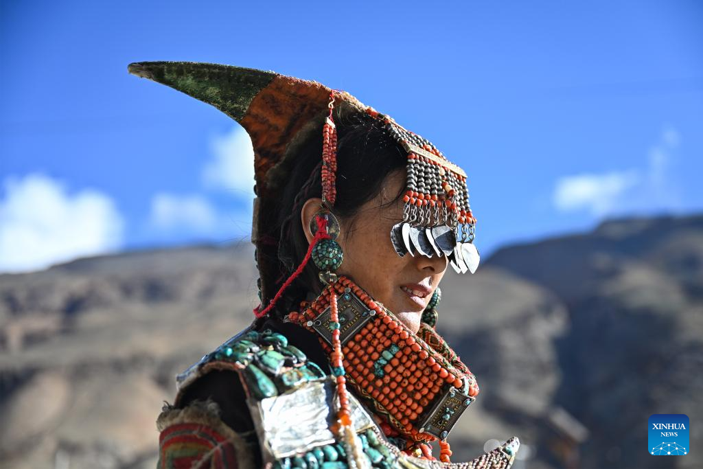 A villager displays folk costume in Kejia Village of Pulan County, southwest China's Xizang Autonomous Region, Sept. 9, 2024. Originating in Pulan County, Pulan folk costume has been a traditional garment worn at celebrations for over a millennium. Weighing more than 20 kilograms, a piece of this unique costume is usually decorated with rare metals and jewels, like gold, silver, beeswax, coral and turquoise. (Xinhua/Sun Ruibo)
