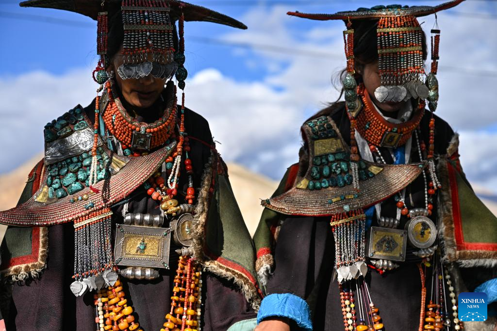 Villagers display folk costume in Kejia Village of Pulan County, southwest China's Xizang Autonomous Region, Sept. 9, 2024. Originating in Pulan County, Pulan folk costume has been a traditional garment worn at celebrations for over a millennium. Weighing more than 20 kilograms, a piece of this unique costume is usually decorated with rare metals and jewels, like gold, silver, beeswax, coral and turquoise. (Xinhua/Sun Ruibo)