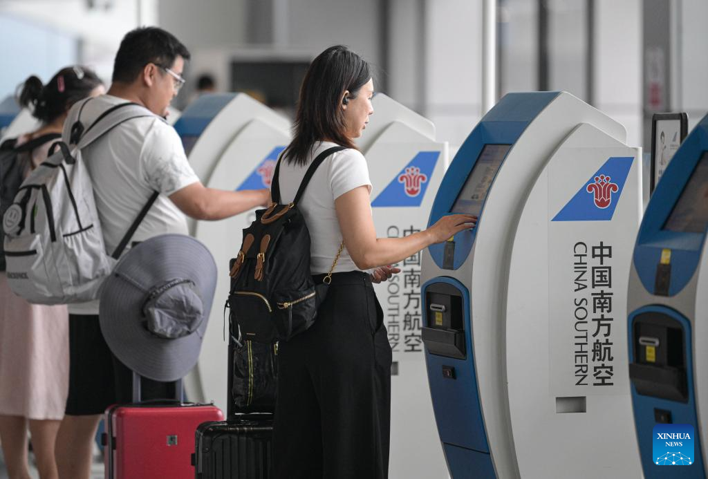 Passengers check in at Haikou Meilan International Airport in Haikou, south China's Hainan Province, Sept. 11, 2024. Hainan has witnessed its production gradually resumed after Super Typhoon Yagi, the 11th typhoon of the year, made landfall in Hainan on Friday and brought damage across the island. (Xinhua/Pu Xiaoxu)