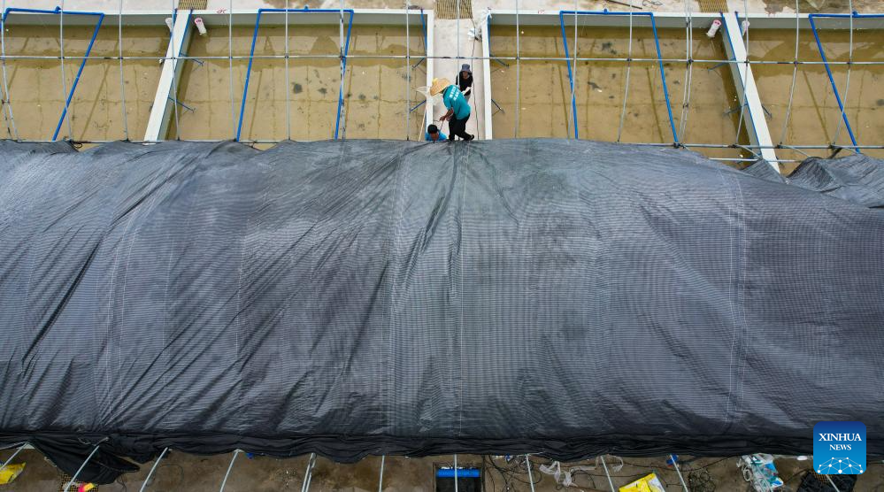 An aerial drone photo shows staff members setting up ceilings for a shrimp fry factory in Wenchang, south China's Hainan Province, Sept. 10, 2024. Hainan has witnessed its production gradually resumed after Super Typhoon Yagi, the 11th typhoon of the year, made landfall in Hainan on Friday and brought damage across the island. (Xinhua/Yang Guanyu)