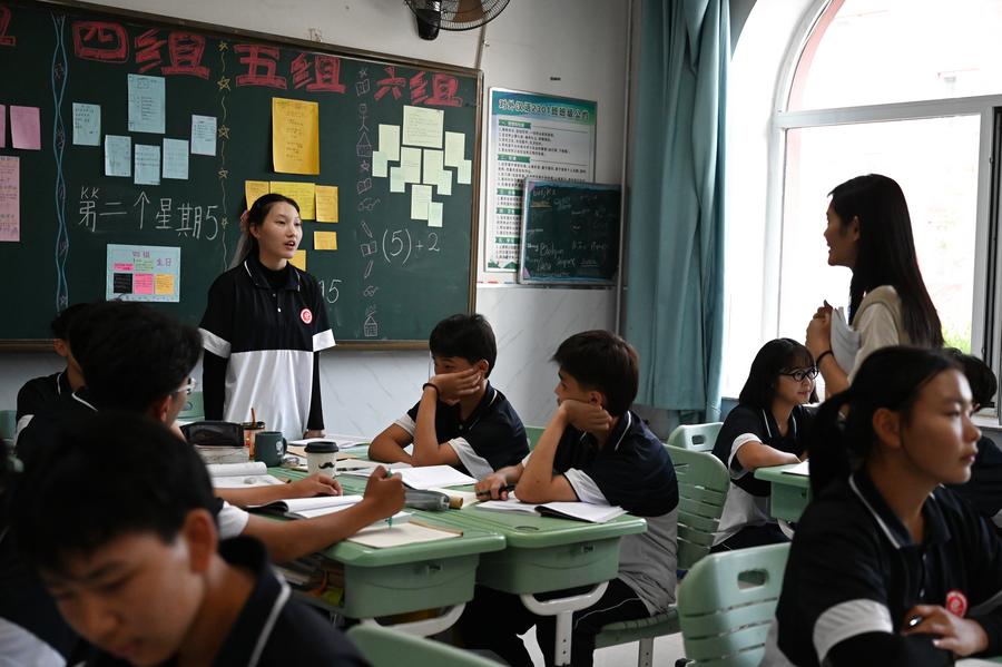 Mongolian high school students take a Chinese language lesson at the No. 1 Middle School of Erenhot in Erenhot, north China's Inner Mongolia Autonomous Region, Sept. 3, 2024. (Xinhua/Wang Xuebing)