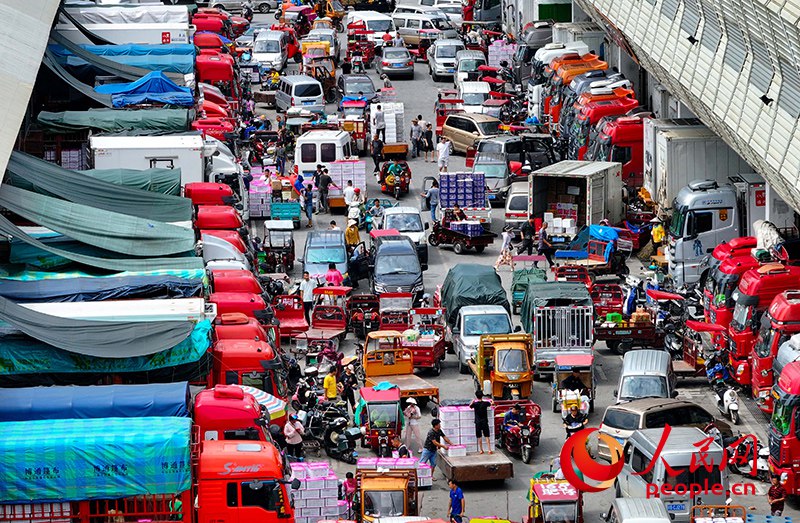 Photo shows a bustling scene of the Haijixing Agricultural Products International Logistics Center in Nanning, capital city of south China's Guangxi Zhuang Autonomous Region. (People's Daily Online/Lei Qijun)
