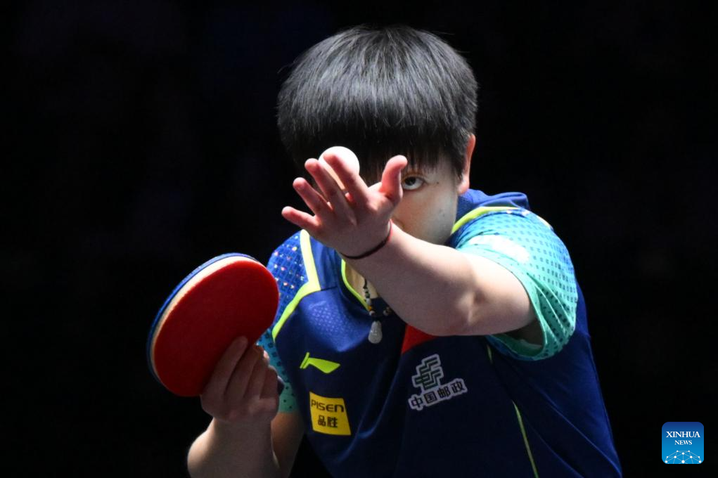 Sun Yingsha of China serves during the women's singles round of 16 match between Sun Yingsha of China and Kim Nayeong of South Korea at the 2024 World Table Tennis (WTT) Champions Macao in Macao, south China, Sept. 11, 2024. (Xinhua/Cheong Kam Ka)