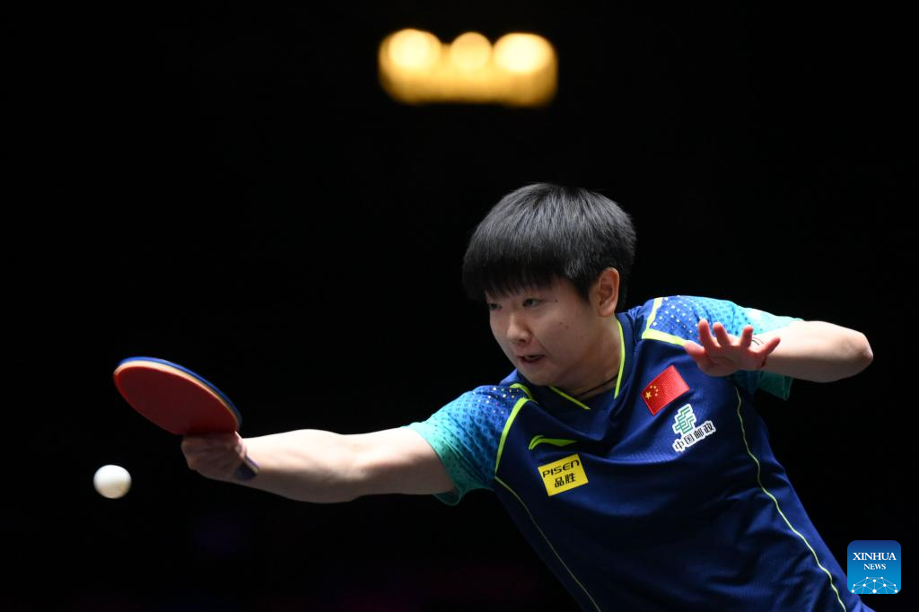 Sun Yingsha of China hits a return during the women's singles round of 16 match between Sun Yingsha of China and Kim Nayeong of South Korea at the 2024 World Table Tennis (WTT) Champions Macao in Macao, south China, Sept. 11, 2024. (Xinhua/Cheong Kam Ka)
