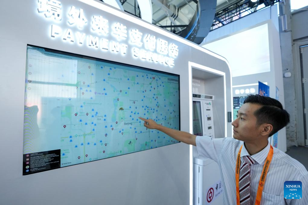A staff member introduces a payment service product during the 2024 China International Fair for Trade in Services (CIFTIS) at the Shougang Park in Beijing, capital of China, Sept. 12, 2024. Themed "Global Services, Shared Prosperity," the 2024 CIFTIS opened at the China National Convention Center and the Shougang Park in Beijing on Thursday. (Xinhua/Ju Huanzong)