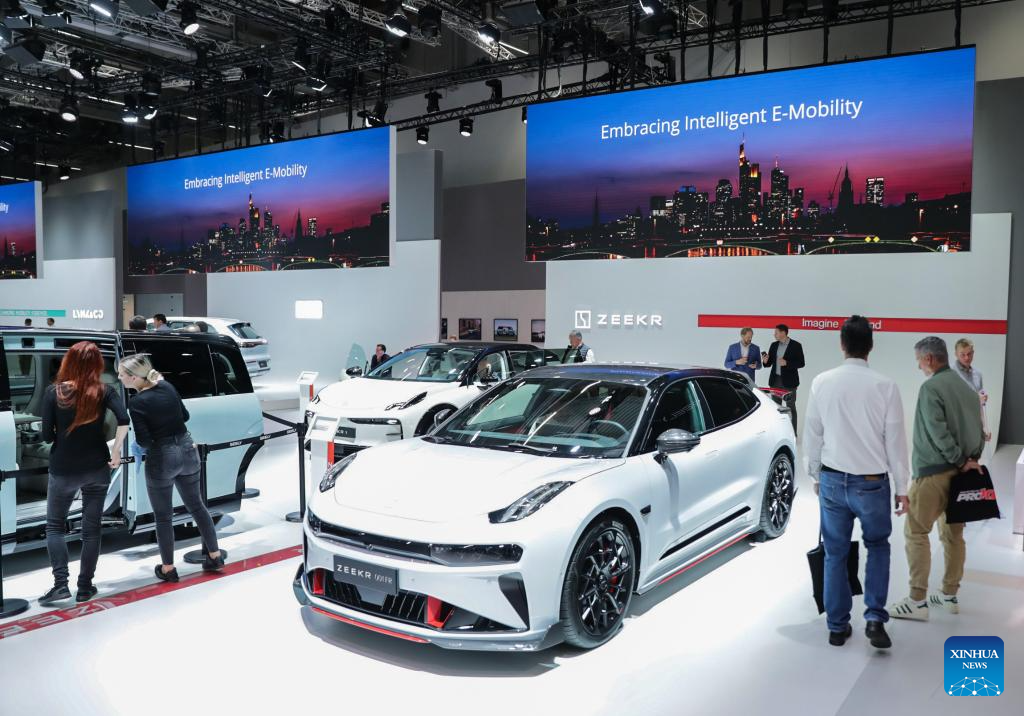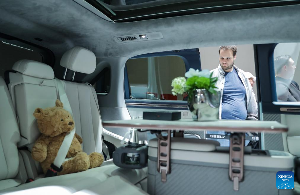 People visit the booth of Geely at the Automechanika in Frankfurt, Germany, Sept. 11, 2024. A leading trade fair for the aftermarket sector of the auto industry, Automechanika, kicked off on Tuesday, highlighting electrification and sustainability.