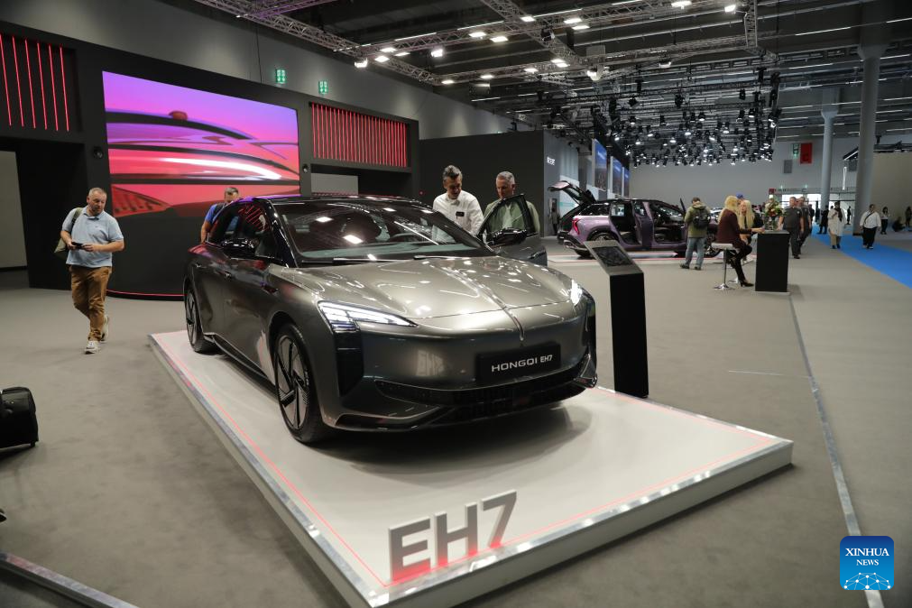 People visit the booth of Hongqi at the Automechanika in Frankfurt, Germany, Sept. 11, 2024. A leading trade fair for the aftermarket sector of the auto industry, Automechanika, kicked off on Tuesday, highlighting electrification and sustainability.