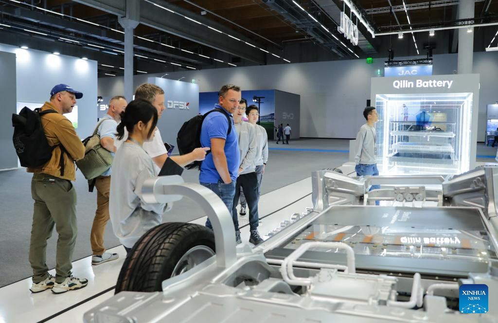 An Electric Vehicle Expo (EVA Expo), hosted by the Automotive Sub-council of China Council for the Promotion of International Trade (CCPIT Auto), is offering trade visitors an opportunity to connect with Chinese auto manufacturers and explore potential partnership opportunities during the Automechanika fair. (Xinhua/Zhang Fan)