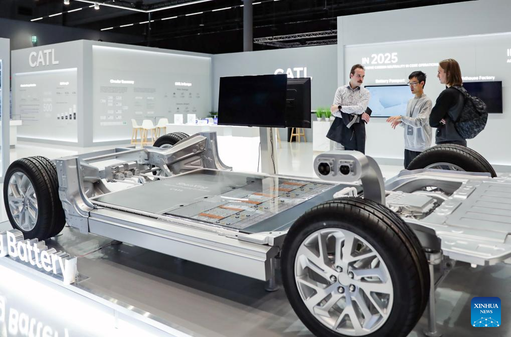 People visit the booth of CATL at the Automechanika in Frankfurt, Germany, Sept. 11, 2024. A leading trade fair for the aftermarket sector of the auto industry, Automechanika, kicked off on Tuesday, highlighting electrification and sustainability.