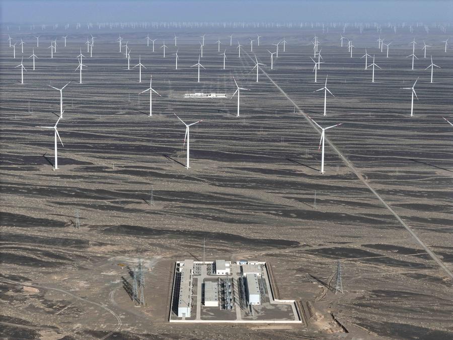 HAMI, Sept. 12 (Xinhua) -- Rich in wind energy resources, Hami City of northwest China's Xinjiang Uygur Autonomous Region is one of the country's major wind power bases. To make the most out of its resource advantages, the city has accelerated the development and construction of wind power projects in recent years to promote green energy transformation. At the same time, many domestic wind power enterprises have also been introduced here to build wind power equipment manufacturing industry chains to promote high-quality economic development.
