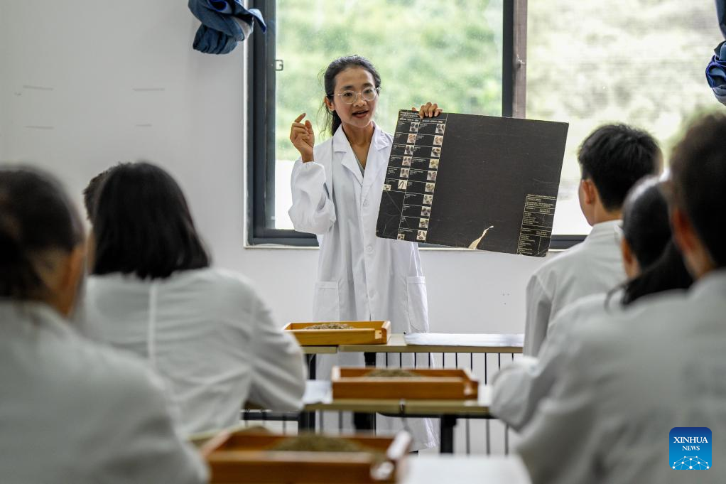 A teacher gives a coffee-themed lecture at the College of Tropical Crops of Yunnan Agricultural University (YAU) in Pu'er City in the southwest Yunnan Province, Sept. 10, 2024. (Xinhua/Hu Chao)