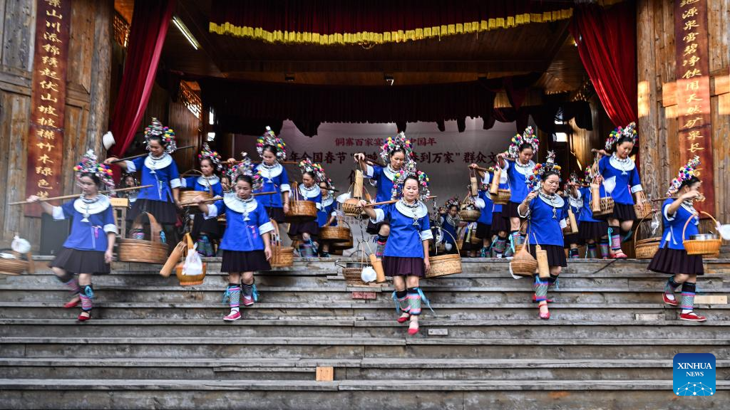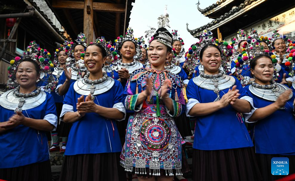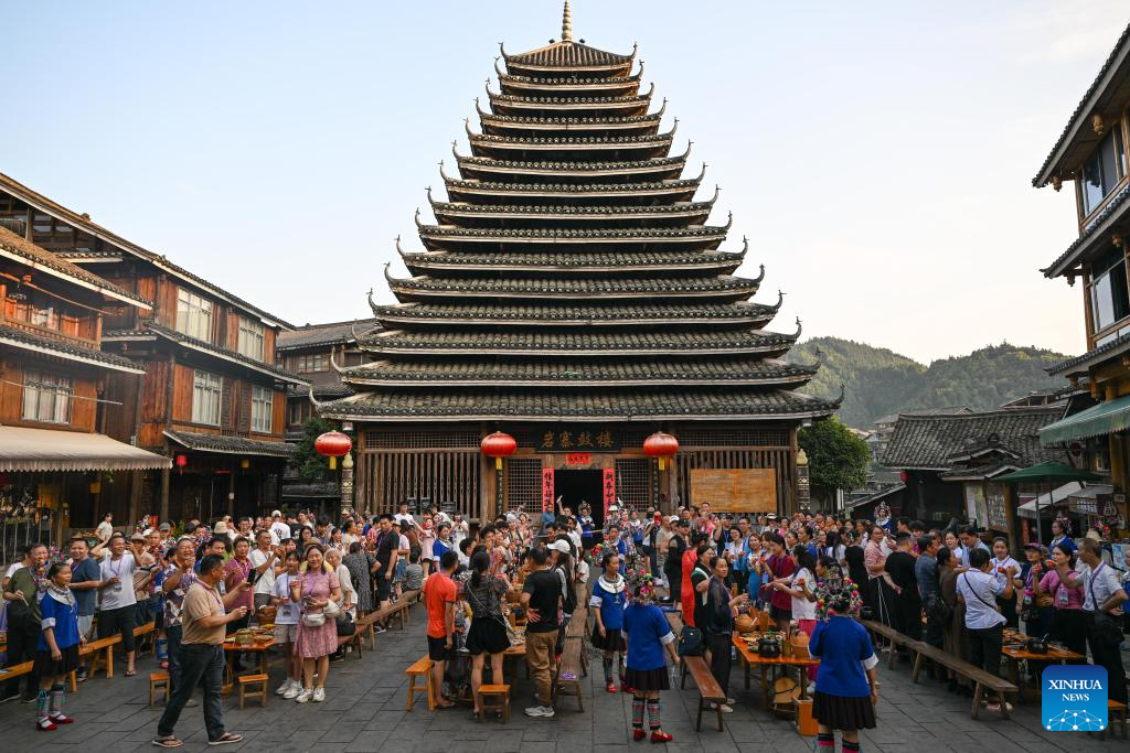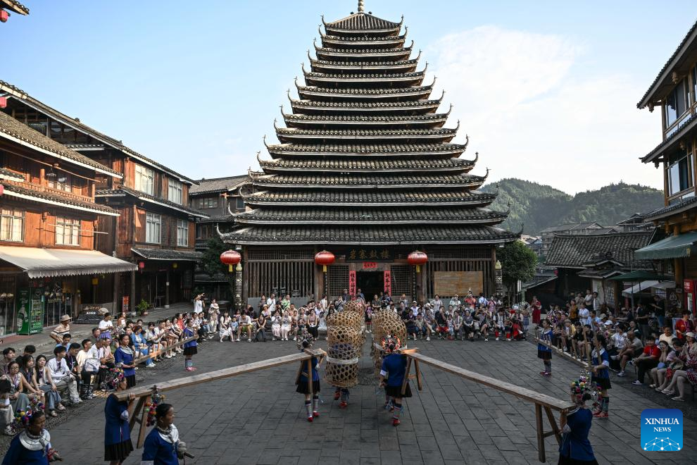 Tourists enjoy folk customs performance of the Dong ethnic group in Chengyang Eight Villages in Sanjiang Dong Autonomous County, south China's Guangxi Zhuang Autonomous Region, Aug. 28, 2024.(Xinhua/Zhang Ailin)