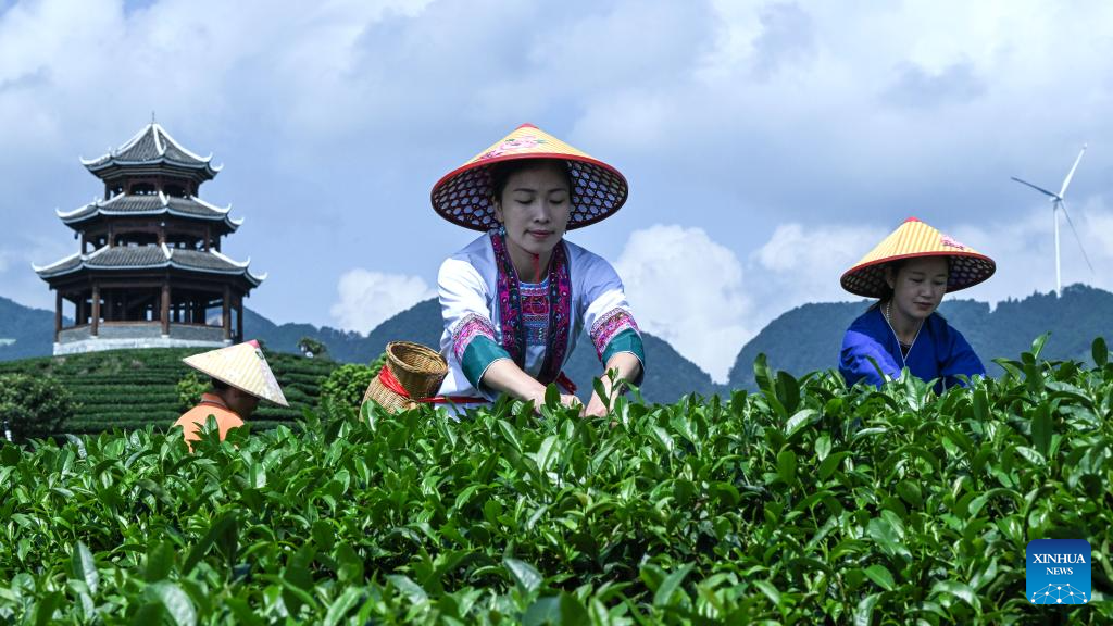 Wu Chunyue (C) picks tea leaves at a tea garden in Sanjiang Dong Autonomous County, south China's Guangxi Zhuang Autonomous Region, Aug. 31, 2024.(Xinhua/Zhang Ailin)
