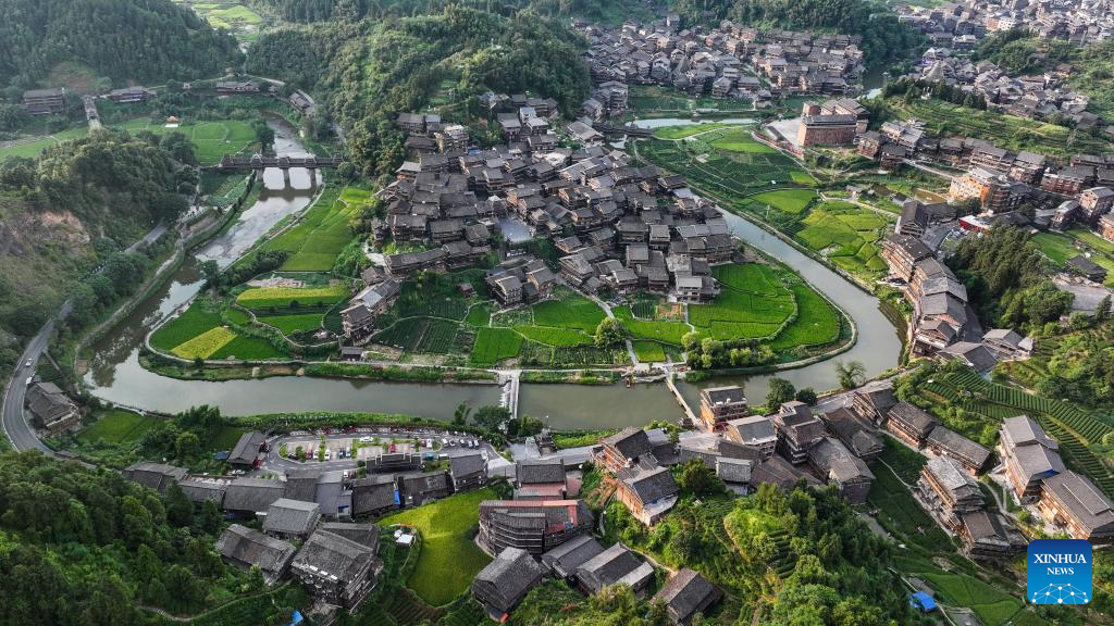 An aerial drone photo taken on Aug. 30, 2024 shows a view of Chengyang Eight Villages in Sanjiang Dong Autonomous County, south China's Guangxi Zhuang Autonomous Region.(Xinhua/Zhang Ailin)