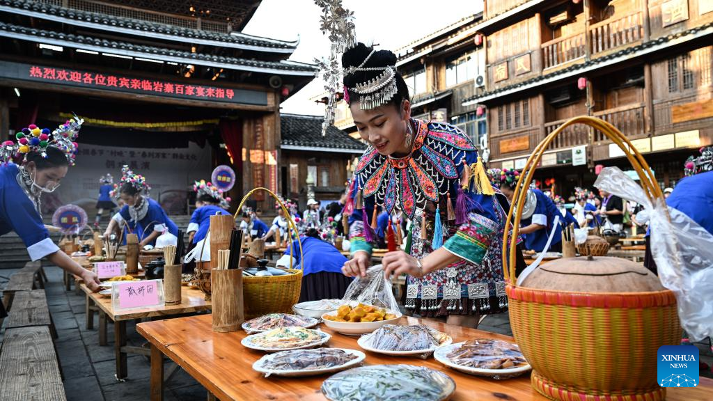 People of the Dong ethnic group prepare a banquet for tourists in Chengyang Eight Villages in Sanjiang Dong Autonomous County, south China's Guangxi Zhuang Autonomous Region, Aug. 28, 2024.(Xinhua/Zhang Ailin)