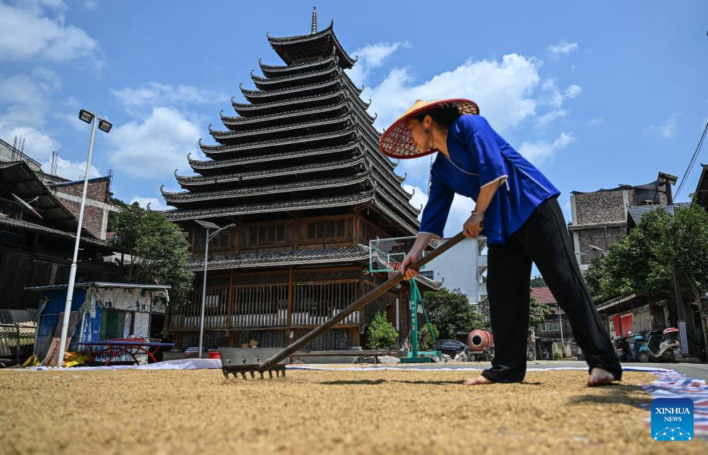 Wu Chunyue airs rice in Sanjiang Dong Autonomous County, south China's Guangxi Zhuang Autonomous Region, Aug. 29, 2024.(Xinhua/Zhang Ailin)