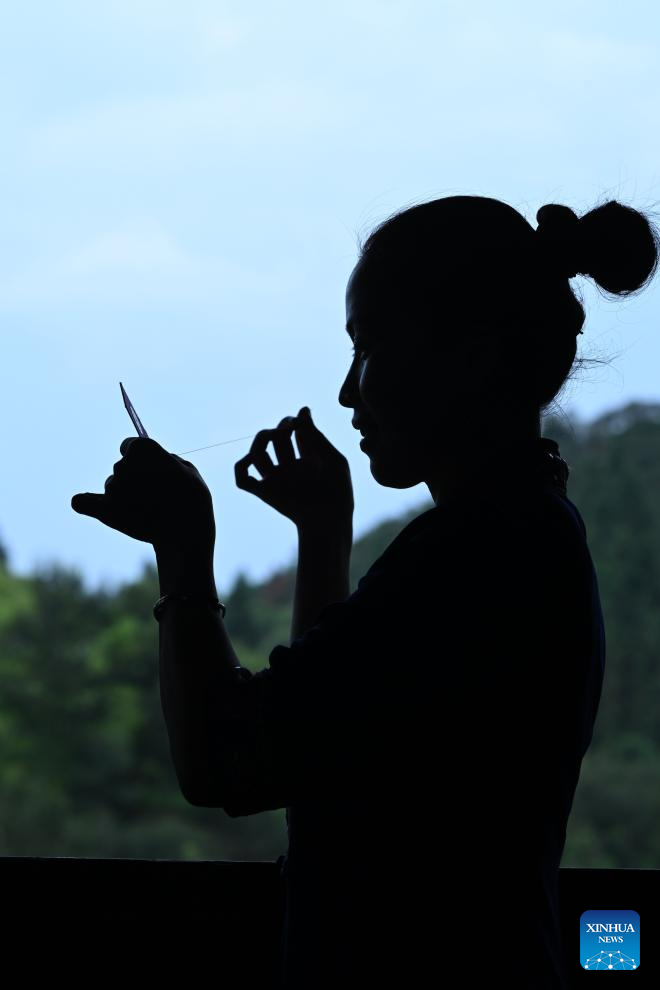 Wu Chunyue experiences Dong embroidery making in Sanjiang Dong Autonomous County, south China's Guangxi Zhuang Autonomous Region, Aug. 30, 2024.(Xinhua/Zhang Ailin)