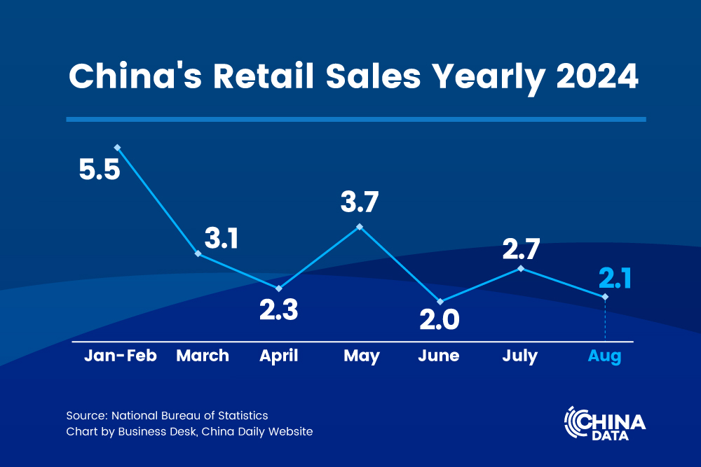 The country's retail sales increased 2.1 percent year-on-year last month, the NBS said.
