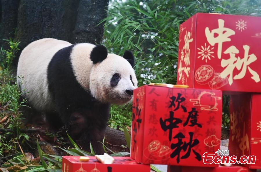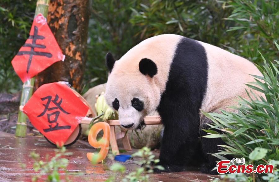 A giant panda enjoys a special birthday cake during a group party at the Bifengxia Giant Panda Base in Ya'an, southwest China's Sichuan Province, Sept. 13, 2024. (Photo: China News Service/An Yuan)