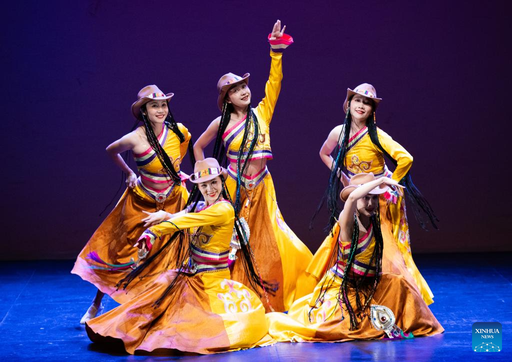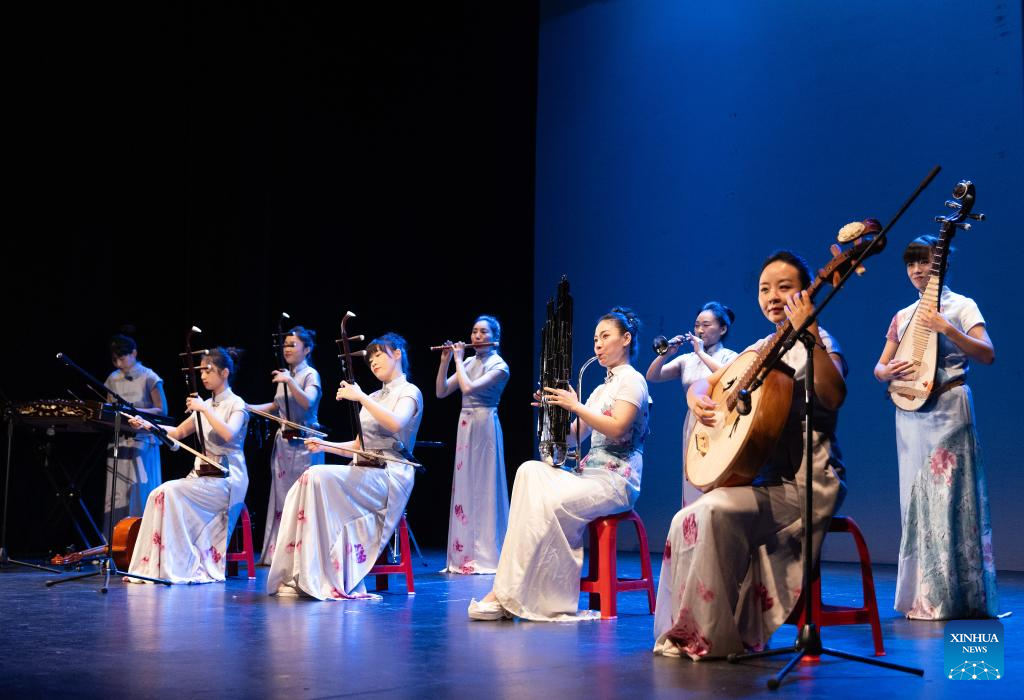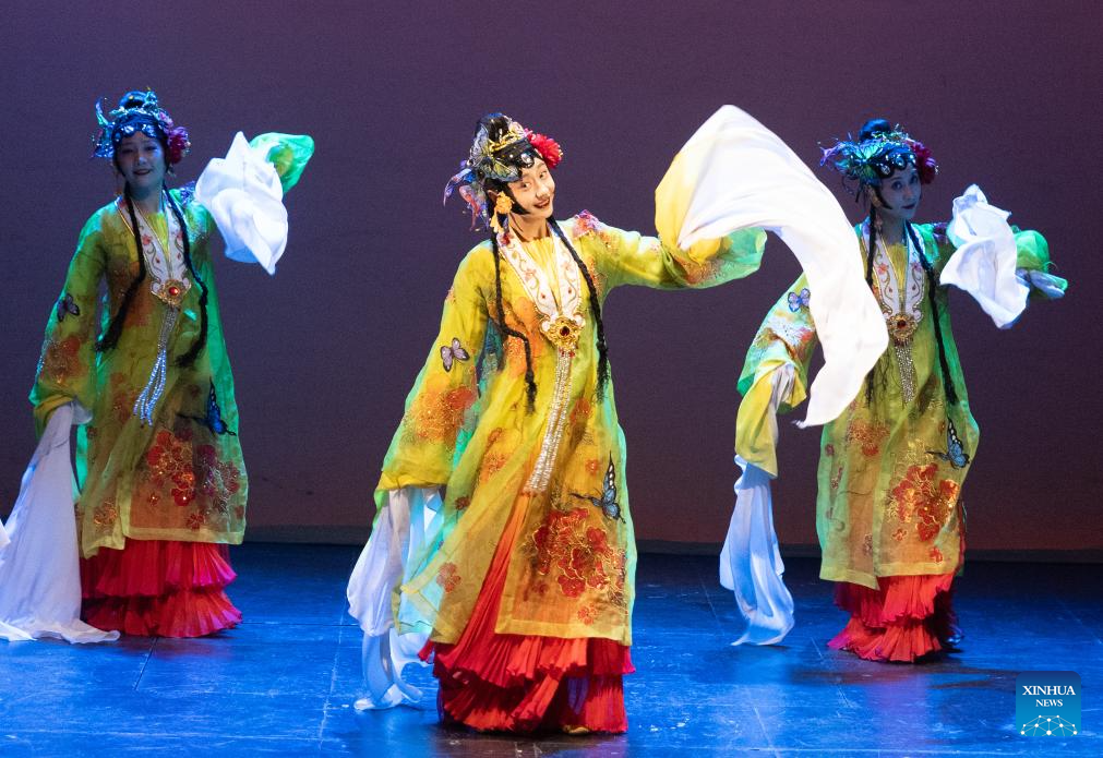 Actresses perform at a celebration event, dubbed "Ode to the Moon," in Mexico City, Mexico, Sept. 12, 2024. The celebration, hosted by the China Culture Center in Mexico City and Sichuan Provincial Department of Culture and Tourism, lasted from Sept. 11 to 13, during which the Sichuan Symphony Orchestra and the Opera and Dance Theater of Sichuan Province staged wonderful performances. (Xinhua/Li Mengxin)