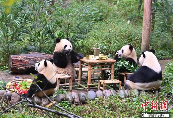 Ya'an base of the China Conservation and Research Center for the Giant Panda in Ya'an city, southwest China's Sichuan Province holds a collective birthday party for several giant pandas, Sept. 13, 2024. (China News Service/An Yuan)
