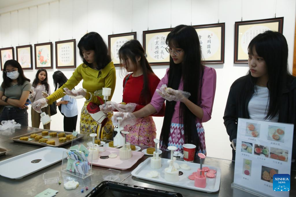 Students make mooncakes during an event to celebrate the upcoming Mid-Autumn Festival at the China Cultural Center in Yangon, Myanmar, Sept. 14, 2024. (Xinhua/Myo Kyaw Soe)