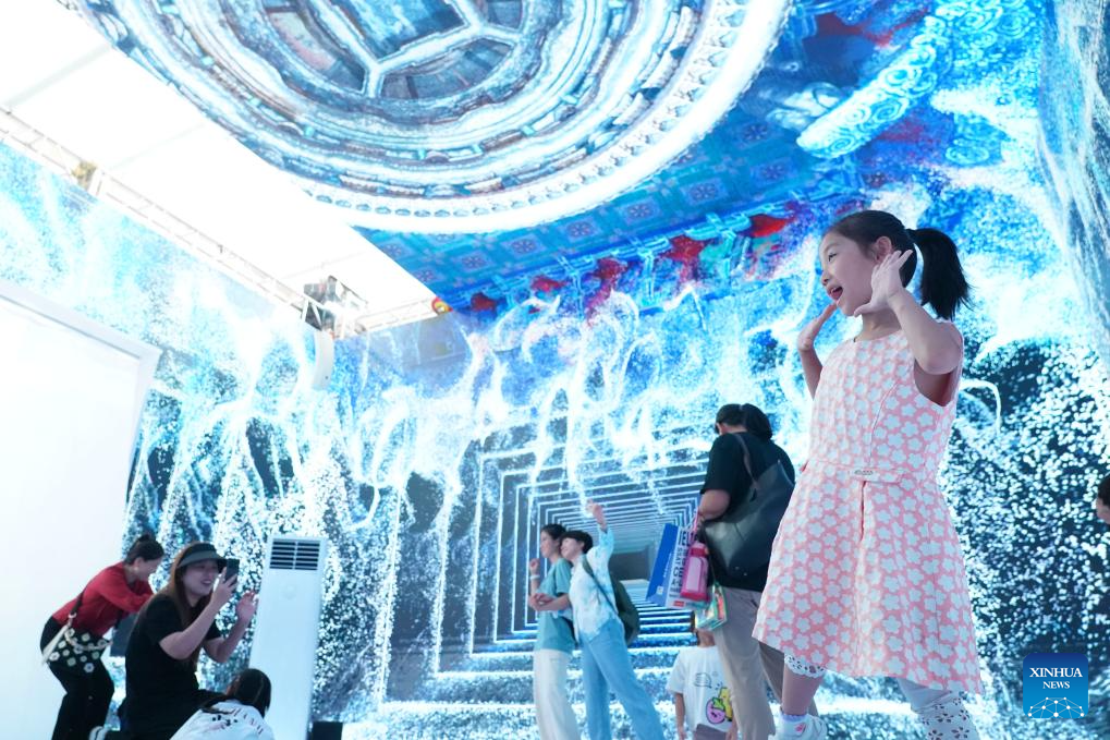 A child immerses herself in a digital art exhibition during the 2024 China International Fair for Trade in Services (CIFTIS) in the Cultural &Tourism Service thematic exhibition area at the Shougang Park in Beijing, capital of China, Sept. 15, 2024. The Cultural &Tourism Service thematic exhibition area of this year's CIFTIS reflects the integration of technology and culture. The exhibitions enable multidimensional presentations with new technologies such as immersive digital spaces, virtual reality (VR), augmented reality (AR), and holographic projection. (Xinhua/Ju Huanzong)