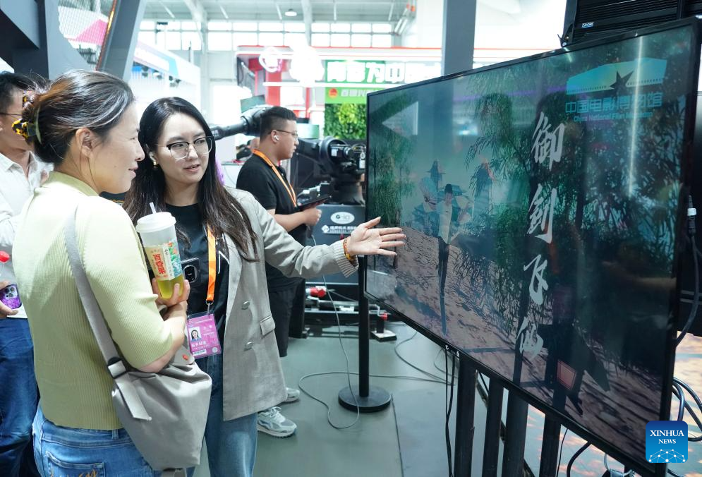 Visitors watch a performance at the booth of Dongcheng District of Beijing during the 2024 China International Fair for Trade in Services (CIFTIS) in the Cultural &Tourism Service thematic exhibition area at the Shougang Park in Beijing, capital of China, Sept. 12, 2024. The Cultural &Tourism Service thematic exhibition area of this year's CIFTIS reflects the integration of technology and culture. The exhibitions enable multidimensional presentations with new technologies such as immersive digital spaces, virtual reality (VR), augmented reality (AR), and holographic projection. (Xinhua/Ju Huanzong)