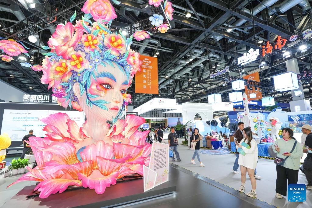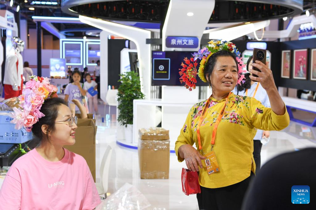 A staff member shows a flowery headwear at the booth of Fujian Province during the 2024 China International Fair for Trade in Services (CIFTIS) at the China National Convention Center in Beijing, capital of China, Sept. 15, 2024. The Cultural &Tourism Service thematic exhibition area of this year's CIFTIS reflects the integration of technology and culture. The exhibitions enable multidimensional presentations with new technologies such as immersive digital spaces, virtual reality (VR), augmented reality (AR), and holographic projection. (Xinhua/Chen Zhonghao)