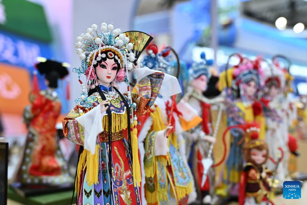 Silk figurines are pictured during the 2024 China International Fair for Trade in Services (CIFTIS) in the Cultural &Tourism Service thematic exhibition area at the Shougang Park in Beijing, capital of China, Sept. 16, 2024. The Cultural &Tourism Service thematic exhibition area of this year's CIFTIS reflects the integration of technology and culture. The exhibitions enable multidimensional presentations with new technologies such as immersive digital spaces, virtual reality (VR), augmented reality (AR), and holographic projection. (Xinhua/Li Xin)