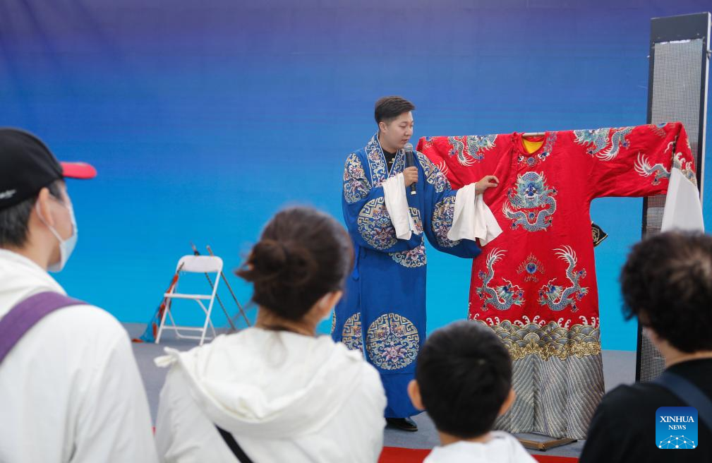 An actor of the Jingju Theater Company of Beijing introduces costumes of Peking Opera during the 2024 China International Fair for Trade in Services (CIFTIS) in the Cultural &Tourism Service thematic exhibition area at the Shougang Park in Beijing, capital of China, Sept. 16, 2024. The Cultural &Tourism Service thematic exhibition area of this year's CIFTIS reflects the integration of technology and culture. The exhibitions enable multidimensional presentations with new technologies such as immersive digital spaces, virtual reality (VR), augmented reality (AR), and holographic projection. (Xinhua/Ding Hongfa)