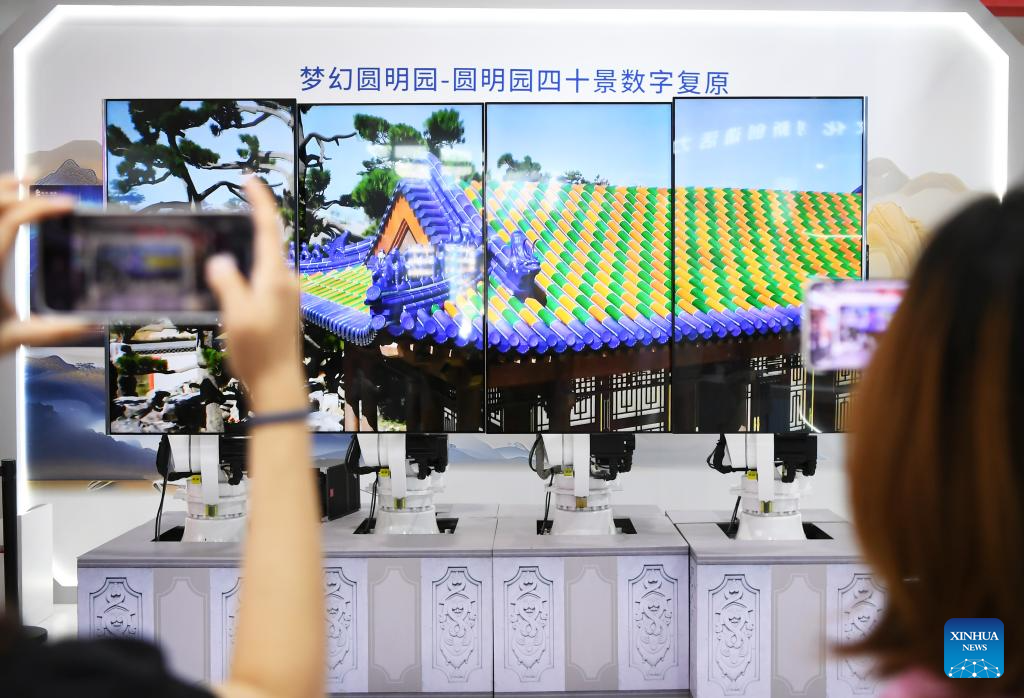 Visitors watch the display of digitally restored Forty Scenes of the Yuanmingyuan, or the Old Summer Palace, during the 2024 China International Fair for Trade in Services (CIFTIS) in the Cultural &Tourism Service thematic exhibition area at the Shougang Park in Beijing, capital of China, Sept. 15, 2024. The Cultural &Tourism Service thematic exhibition area of this year's CIFTIS reflects the integration of technology and culture. The exhibitions enable multidimensional presentations with new technologies such as immersive digital spaces, virtual reality (VR), augmented reality (AR), and holographic projection. (Xinhua/Ju Huanzong)