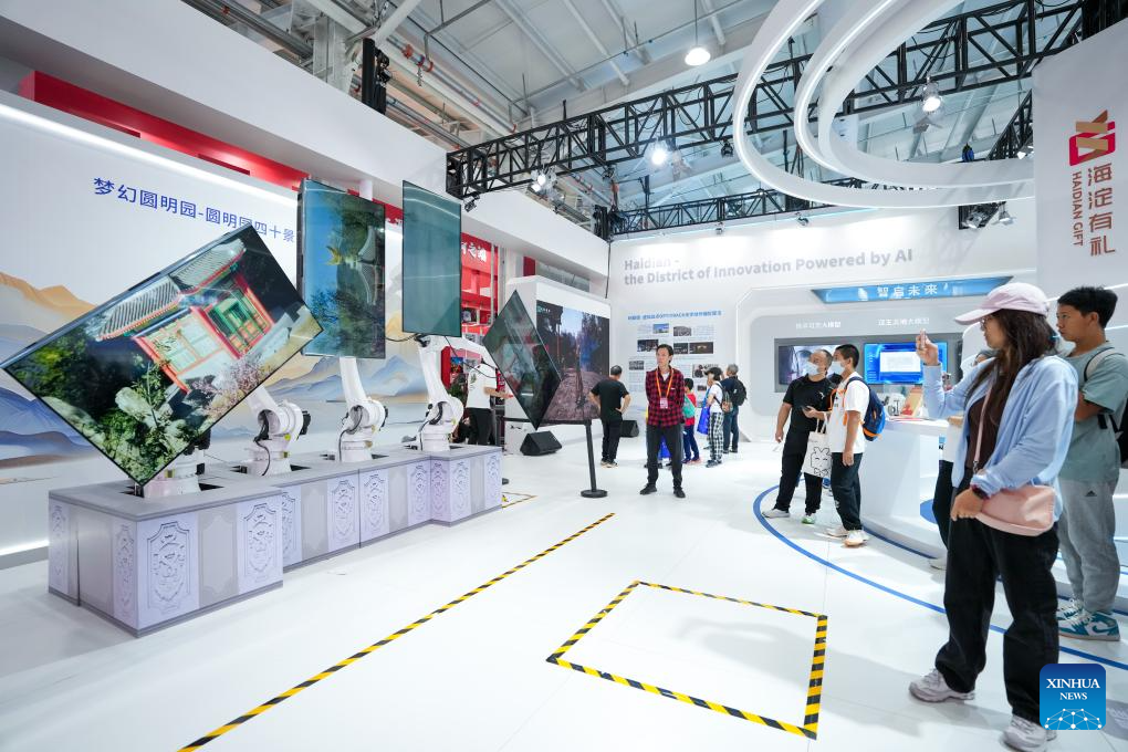 Visitors look at a digital image of the Beijing Central Axis during the 2024 China International Fair for Trade in Services (CIFTIS) in the Cultural &Tourism Service thematic exhibition area at the Shougang Park in Beijing, capital of China, Sept. 16, 2024. The Cultural &Tourism Service thematic exhibition area of this year's CIFTIS reflects the integration of technology and culture. The exhibitions enable multidimensional presentations with new technologies such as immersive digital spaces, virtual reality (VR), augmented reality (AR), and holographic projection. (Xinhua/Ding Hongfa)