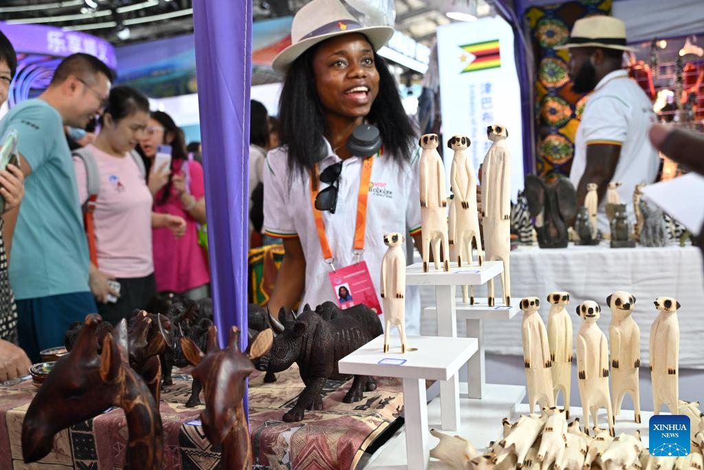 Woodcarvings are pictured at the booth of Embassy of the Republic of Zimbabwe during the 2024 China International Fair for Trade in Services (CIFTIS) at the Shougang Park in Beijing, capital of China, Sept. 16, 2024. The Cultural &Tourism Service thematic exhibition area of this year's CIFTIS reflects the integration of technology and culture. The exhibitions enable multidimensional presentations with new technologies such as immersive digital spaces, virtual reality (VR), augmented reality (AR), and holographic projection. (Xinhua/Li Xin)