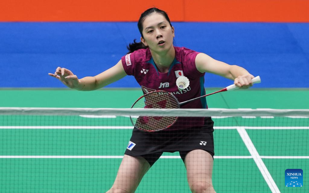 Ohori Aya of Japan hits a return during the women's singles 1st round match against Ratchanok Intanon of Thailand at the China Open 2024 badminton tournament in Changzhou, east China's Jiangsu Province, Sept. 17, 2024. (Xinhua/Yang Lei)