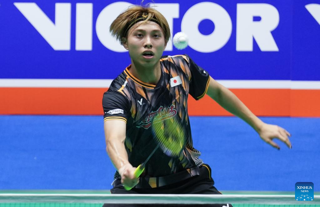 Naraoka Kodai of Japan hits a return to his compatriot Obayashi Takuma during the men's singles 1st round match at the China Open 2024 badminton tournament in Changzhou, east China's Jiangsu Province, Sept. 17, 2024. (Xinhua/Yang Lei)