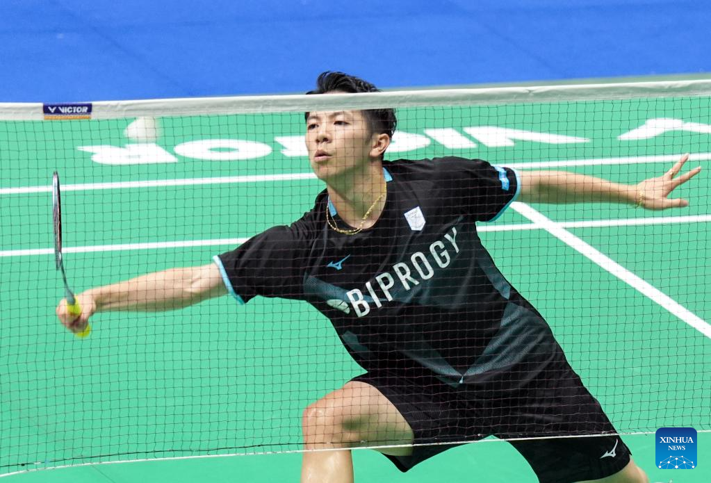 Watanabe Koki of Japan hits a return to Lee Zii Jia of Malaysia during the men's singles 1st round match at the China Open 2024 badminton tournament in Changzhou, east China's Jiangsu Province, Sept. 17, 2024. (Xinhua/Yang Lei)
