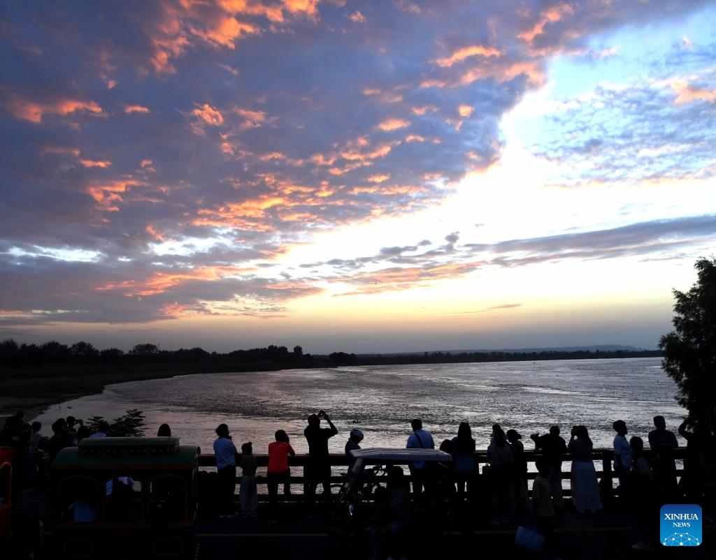 Tourists enjoy the sunset at a park in Zhengzhou, central China's Henan Province, Sept. 17, 2024. (Photo by Zhou Yong/Xinhua)
