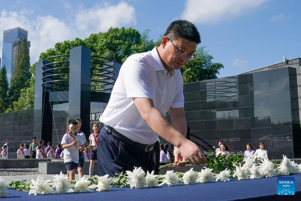 People present flowers during an activity marking the 93rd anniversary of the "September 18 Incident" at the Memorial Hall of the Victims in Nanjing Massacre by Japanese Invaders in Nanjing, east China's Jiangsu Province, Sept. 18, 2024. People from Nanjing and other places commemorated the 93rd anniversary of September 18 Incident, which marked the outbreak of Japan's large-scale invasion of China. (Xinhua/Li Bo)