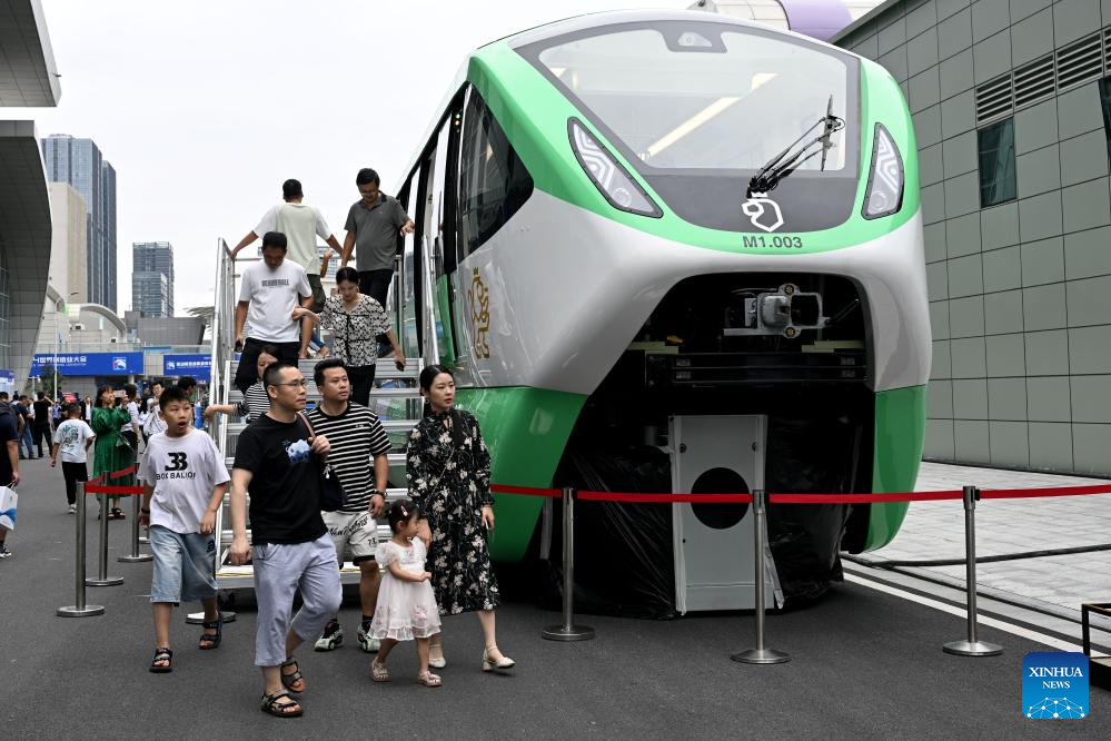Visitors learn about a straddle-type monorail train at the 2024 World Manufacturing Convention in Hefei, east China's Anhui Province, Sept. 21, 2024. (Xinhua/Huang Bohan)