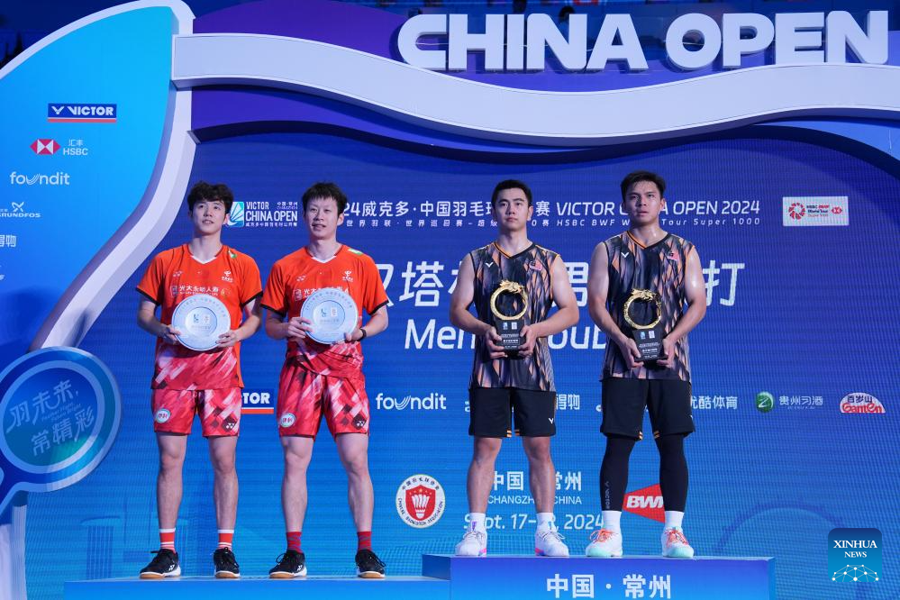 Winners Goh Sze Fei/Nur Izzuddin (R) of Malaysia pose during the awarding ceremony for the men's doubles event at the China Open 2024 badminton tournament in Changzhou, east China's Jiangsu Province, Sept. 22, 2024. (Xinhua/Li Bo)