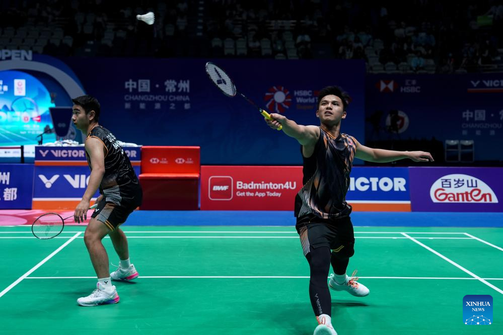 Goh Sze Fei/Nur Izzuddin (R) of Malaysia compete during the men's doubles final match against He Jiting/Ren Xiangyu of China at the China Open 2024 badminton tournament in Changzhou, east China's Jiangsu Province, Sept. 22, 2024. (Xinhua/Li Bo)