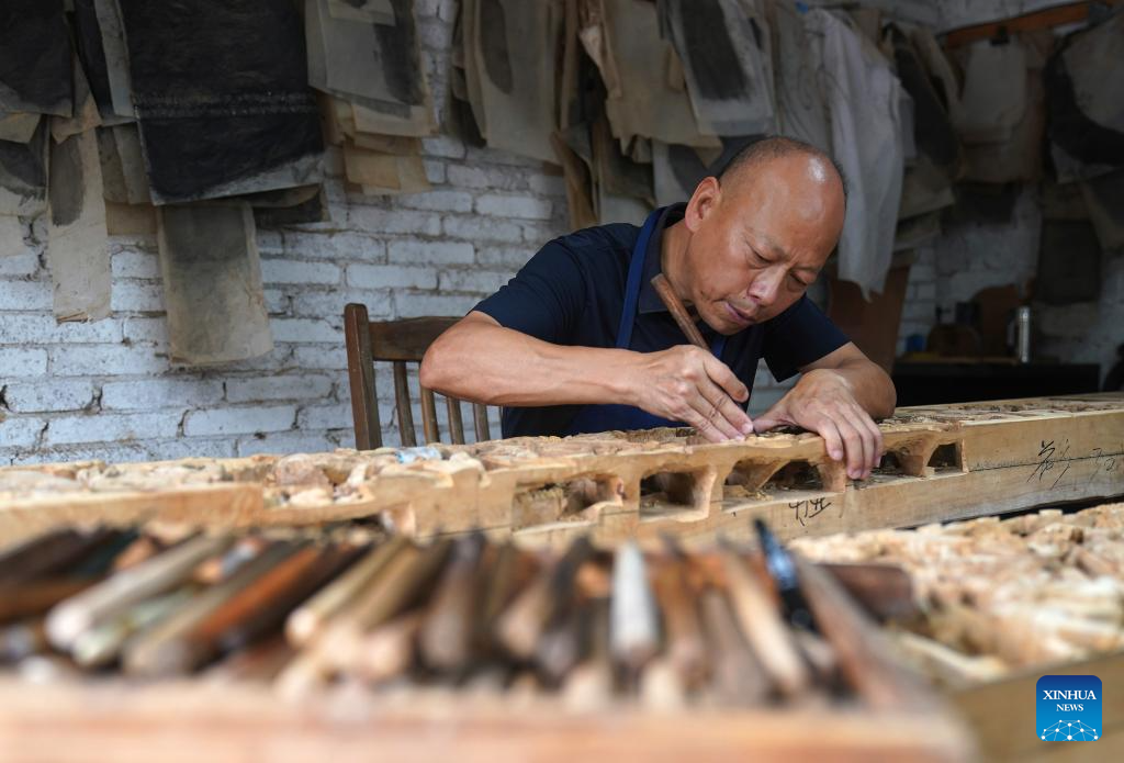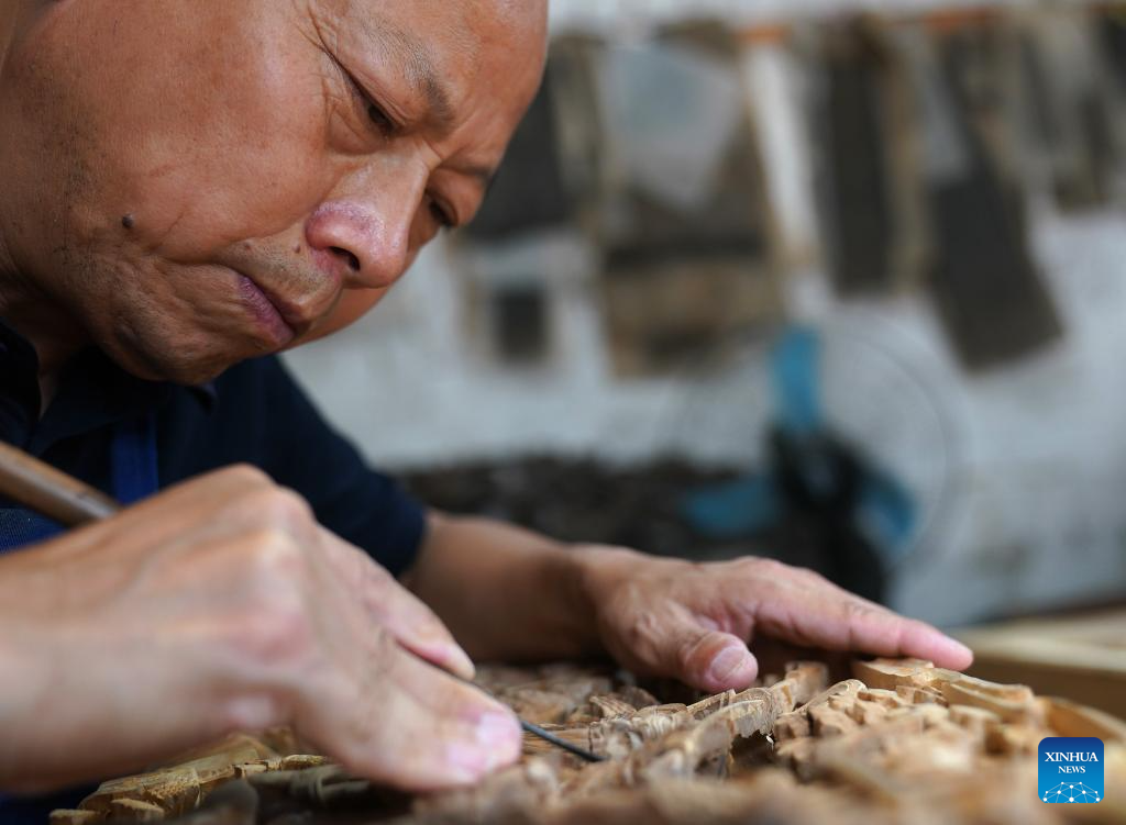 Yu Youhong carves wood in Wangkou Village of Wuyuan County, east China's Jiangxi Province, Sept. 20, 2024. (Xinhua/Wan Xiang)