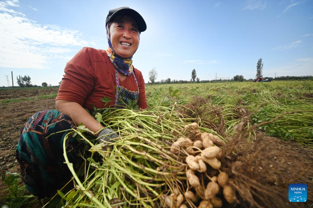 A farmer harvests peanuts at Gezhai Village in Kaifeng City, central China's Henan Province, Sept. 21, 2024. (Photo by Li Junsheng/Xinhua)