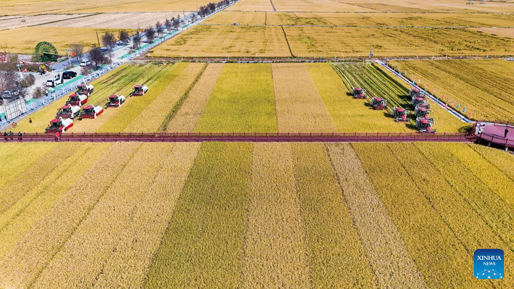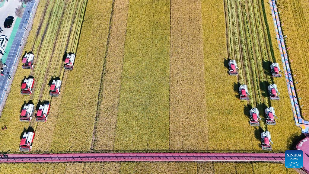 An aerial drone photo shows harvesters working in a paddy field in Fangzheng County of Harbin, northeast China's Heilongjiang Province, Sept. 22, 2024. (Xinhua/Wang Song)