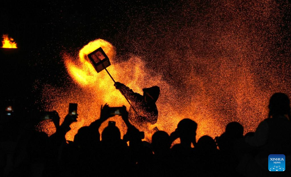 Folk artists throw molten iron to create fireworks in Haiyang, east China's Shandong Province, Sept. 21, 2024. The event aims to commemorate the seventh Chinese farmers' harvest festival which falls on Sept. 22 this year. (Xinhua/Xu Suhui)