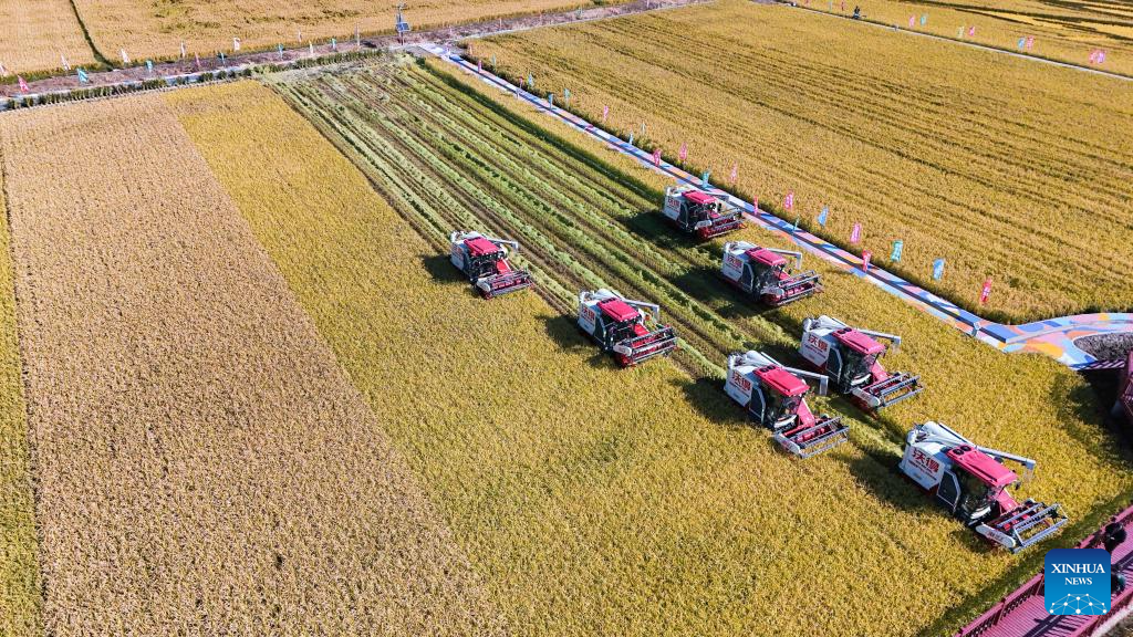 Farmers harvest rice at Zhanglou Village of Xinyang City, central China's Henan Province, Sept. 22, 2024. (Photo by Xie Wanbo/Xinhua)