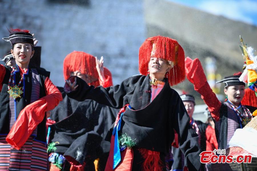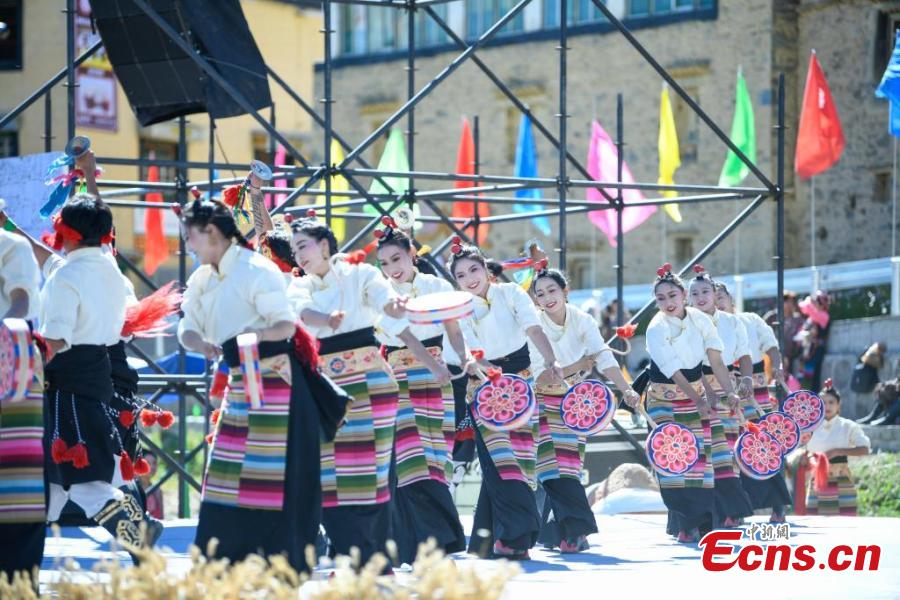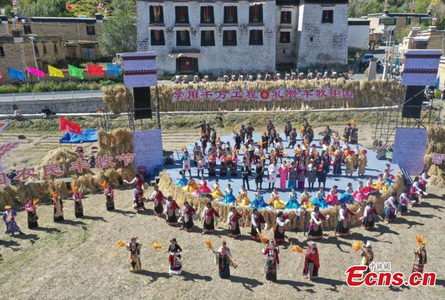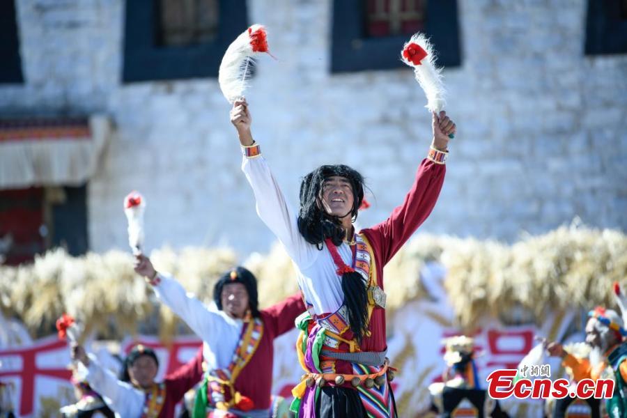 A performance is staged to celebrate the 7th Chinese Farmers' Harvest Festival in Shannan City, southwest China's Xizang Autonomous Region, Sept. 22, 2024. (Photo/China News Service)