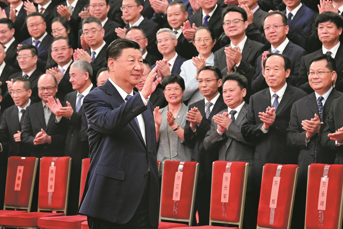 President Xi Jinping greets representatives of space scientists and engineers who participated in the research and development of the Chang'e 6 lunar mission, at the Great Hall of the People in Beijing on Monday. (XIE HUANCHI/XINHUA)