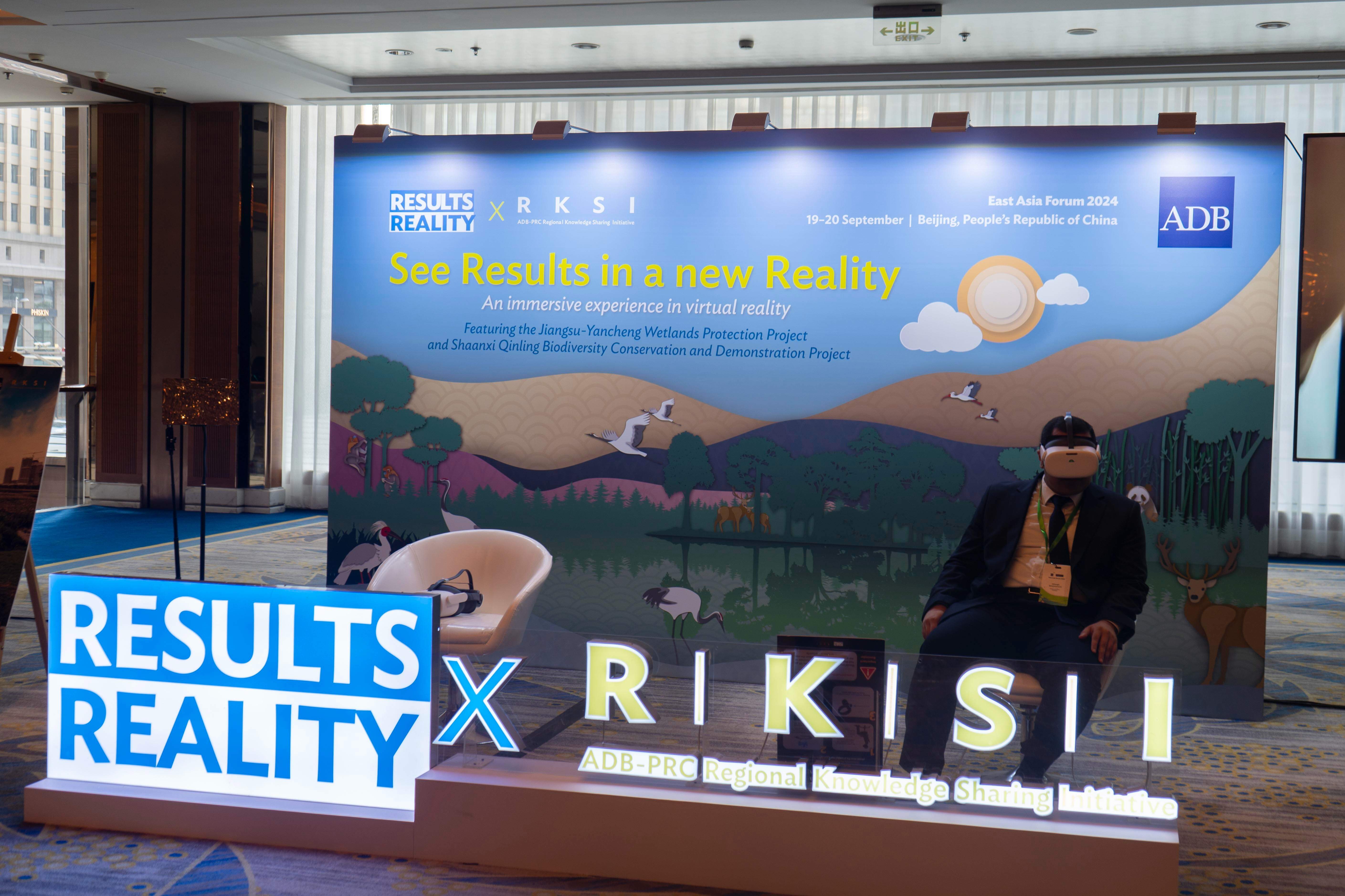 Outside the conference room, a "Results Reality Booth" showcased two ADB projects in China: the Jiangsu Yancheng Wetlands Protection Project and the Shaanxi Qinling Biodiversity Conservation and Demonstration Project.